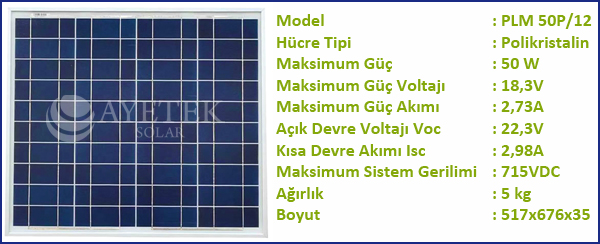 Güneş Paneli: 18V/50W (Yüksek Verimli Monokristal)